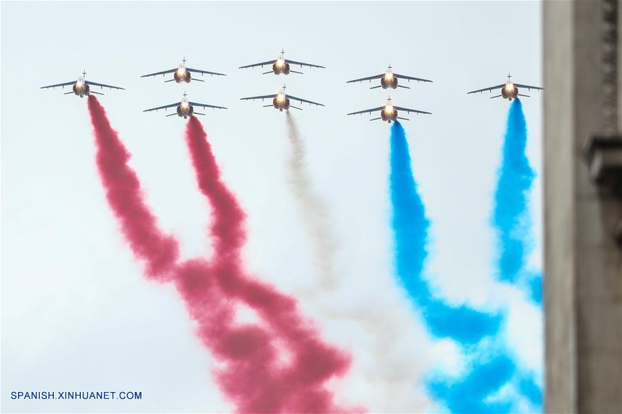 PARIS, noviembre 11, 2018 (Xinhua) -- El equipo acrobático de la Patrouille de France vuela sobre el Arco del Triunfo previo a la ceremonia para conmemorar el centenario del fin de la Primera Guerra Mundial, en París, Francia, el 11 de noviembre de 2018. (Xinhua/Zheng Huansong)