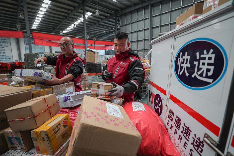 Trabajadores clasifican paquetes en Lianyungang, provincia de Jiangsu, 11 de noviembre del 2018. (Foto: Si Wei/ China Daily)