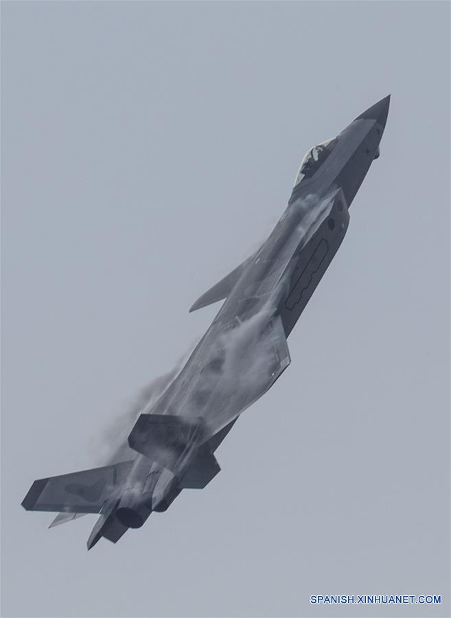 GUANGDONG, noviembre 11, 2018 (Xinhua) -- Un avión de combate J-20 participa durante la XII Exposición Internacional de Aviación y Aeroespacial de China (Airshow China), en Zhuhai, en la provincia de Guangdong, en el sur de China, el 11 de noviembre de 2018, conmemorando del 69 aniversario de la Fuerza Aérea del Ejército Popular de Liberación (EPL). (Xinhua/Liu Yinghua)