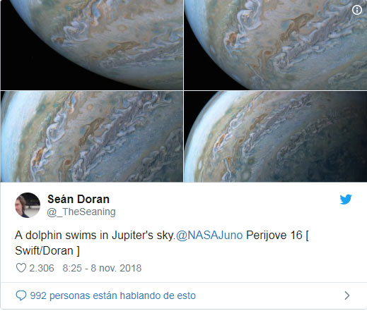 Además, Seán Doran compartió en Twitter unas asombrosas imágenes que muestran una figura entre las nubes de Júpiter que se asemeja a un delfín.