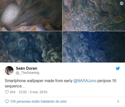 De acuerdo al comunicado de la agencia espacial, las fotos, procesadas por los científicos Seán Doran y Gerald Eichstadt, se tomaron a finales de octubre cuando Juno realizó su decimosexto acercamiento al gigante gaseoso. En ese momento la sonda navegaba a unos 7.000 kilómetros por encima de las nubes del planeta.