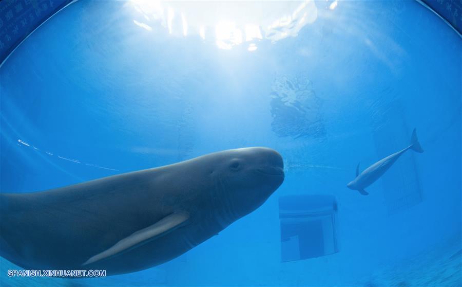 HUBEI, noviembre 13, 2018 (Xinhua) -- Imagen del 10 de noviembre de 2018 de un cuidador brindando adiestramiento de atención médica a las marsopas sin aleta del Yangtze en el Acuario de Delfines Río Yangtze del Instituto de Hidrobiología de la Academia de Ciencias de China, en Wuhan, capital de la provincia de Hubei, en el centro de China. Con una boca ligeramente curvada, la marsopa sin aleta del Yangtze es a menudo llamada "ángel sonriente" del Yangtze por los chinos. Sin embargo, la población ha estado disminuyendo rápidamente en las últimas tres décadas debido al deterioro ambiental. La especie está ahora al borde de la extinción con una población de alrededor de 1,000 en la vía fluvial principal del Yangtze, de acuerdo con una investigación realizada en 2012. (Xinhua/Xiao Yijiu)