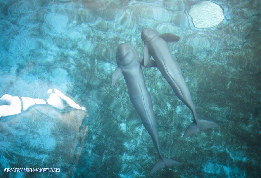 HUBEI, noviembre 13, 2018 (Xinhua) -- Imagen del 10 de noviembre de 2018 de marsopas sin aleta del Yangtze nadando en el Acuario de Delfines Río Yangtze del Instituto de Hidrobiología de la Academia de Ciencias de China, en Wuhan, capital de la provincia de Hubei, en el centro de China. Con una boca ligeramente curvada, la marsopa sin aleta del Yangtze es a menudo llamada "ángel sonriente" del Yangtze por los chinos. Sin embargo, la población ha estado disminuyendo rápidamente en las últimas tres décadas debido al deterioro ambiental. La especie está ahora al borde de la extinción con una población de alrededor de 1,000 en la vía fluvial principal del Yangtze, de acuerdo con una investigación realizada en 2012. (Xinhua/Xiao Yijiu)