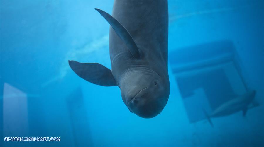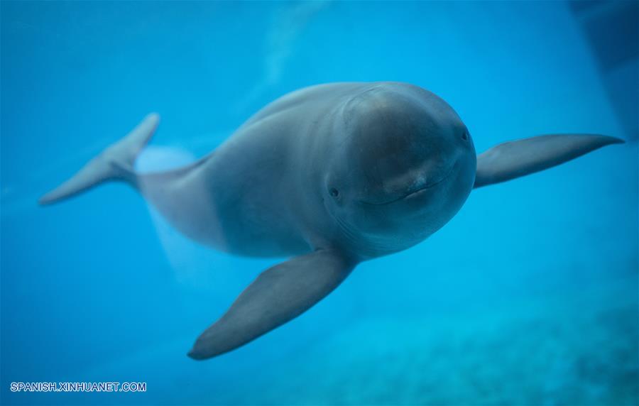 HUBEI, noviembre 13, 2018 (Xinhua) -- Imagen del 10 de noviembre de 2018 de una marsopa sin aleta del Yangtze nadando en el Acuario de Delfines Río Yangtze del Instituto de Hidrobiología de la Academia de Ciencias de China, en Wuhan, capital de la provincia de Hubei, en el centro de China. Con una boca ligeramente curvada, la marsopa sin aleta del Yangtze es a menudo llamada "ángel sonriente" del Yangtze por los chinos. Sin embargo, la población ha estado disminuyendo rápidamente en las últimas tres décadas debido al deterioro ambiental. La especie está ahora al borde de la extinción con una población de alrededor de 1,000 en la vía fluvial principal del Yangtze, de acuerdo con una investigación realizada en 2012. (Xinhua/Xiao Yijiu)