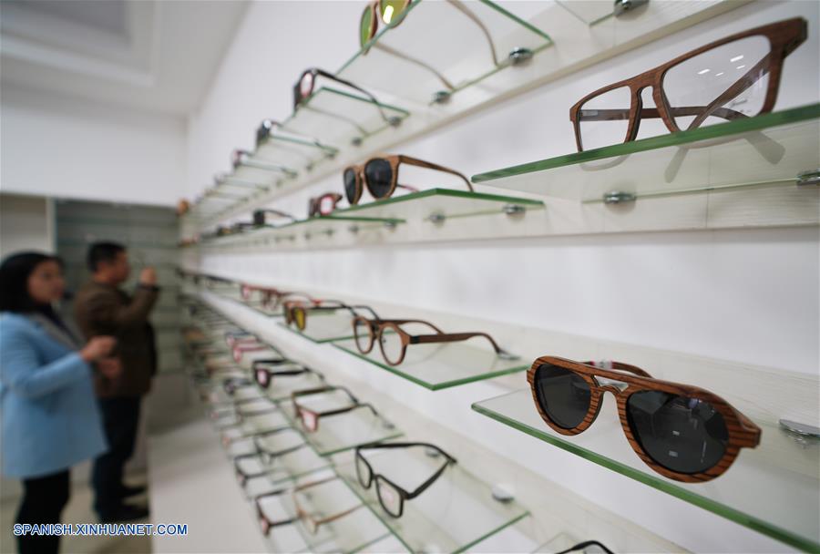 JIANGXI, noviembre 13, 2018 (Xinhua) -- Personas observan monturas de gafas de bambú, productos de la empresa de Luo Xiaoping, en el condado de Fengxin, provincia de Jiangxi, en el este de China, el 13 de noviembre de 2018. Luo Xiaoping, de 42 a?os de edad, regresó a su ciudad natal en Fengxin y comenzó su negocio de monturas de gafas de bambú en 2014. Con varios avances técnicos, Luo y su equipo han solicitado múltiples patentes, y han hecho que sus productos amigables con el medio ambiente lleguen a los mercados extranjeros. (Xinhua/Song Zhenping)