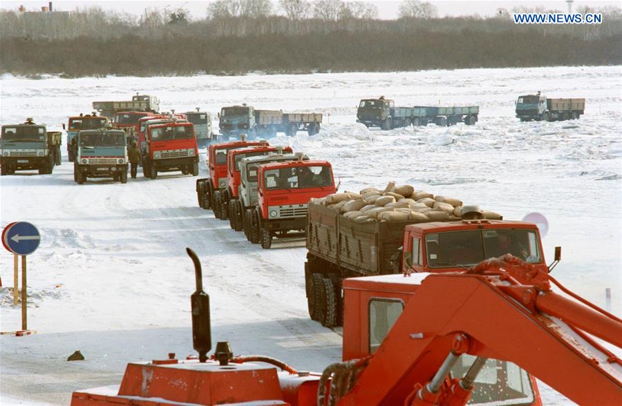 Maquinaria y materiales se importan desde Rusia a través del río Songhua, congelado en ese período del a?o. [Foto: Xinhua]