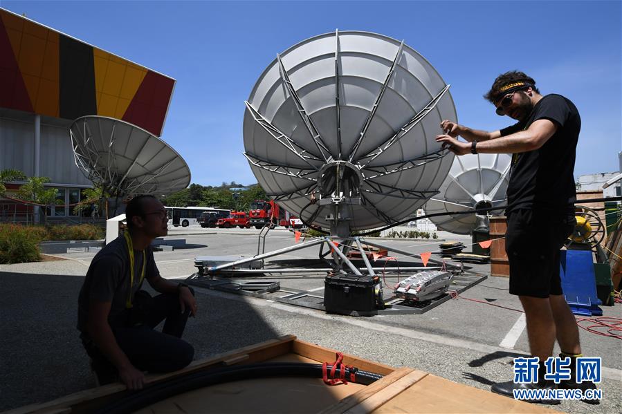 El 13 de noviembre, el personal instalaba los equipos satelitales en el Centro Internacional de Medios de APEC en Port Moresby, Papúa Nueva Guinea. Por Lu Xiaowei, Agencia de Noticias Xinhua