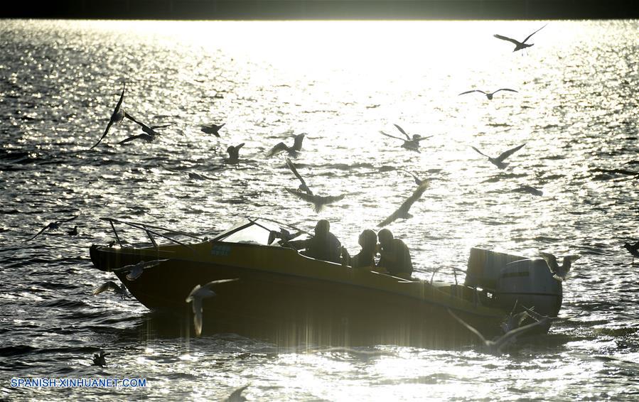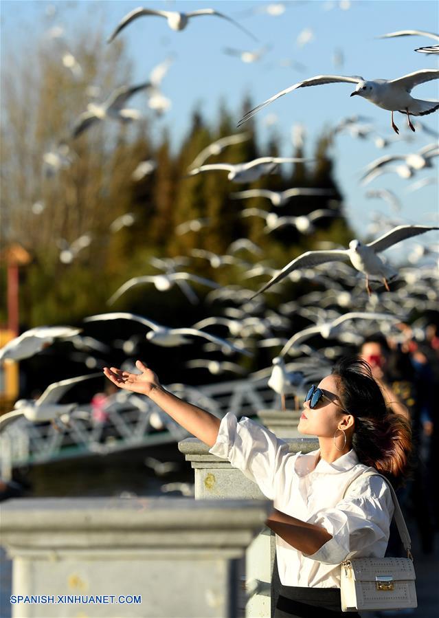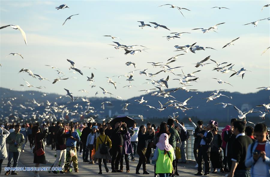 YUNNAN, noviembre 14, 2018 (Xinhua) -- Personas alimentan gaviotas de pico rojo en el Lago Dianchi, en Kunming, capital de la provincia de Yunnan, en el suroeste de China, el 14 de noviembre de 2018. Las gaviotas de pico rojo vuelan a Kunming en busca de un clima más cálido para pasar el invierno. (Xinhua/Lin Yiguang)
