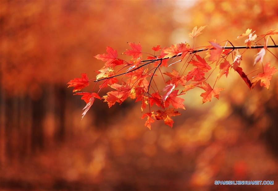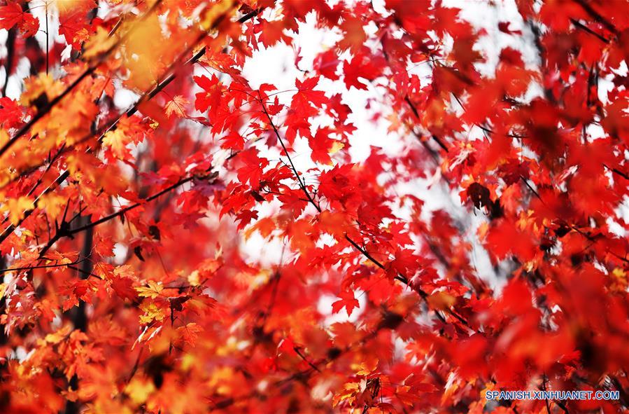SHANDONG, noviembre 14, 2018 (Xinhua) -- Vista de hojas de arce en un bosque, en el condado de Tancheng Linyi, provincia de Shandong, en el este de China, el 14 de noviembre de 2018. (Xinhua/Zhang Chunlei)