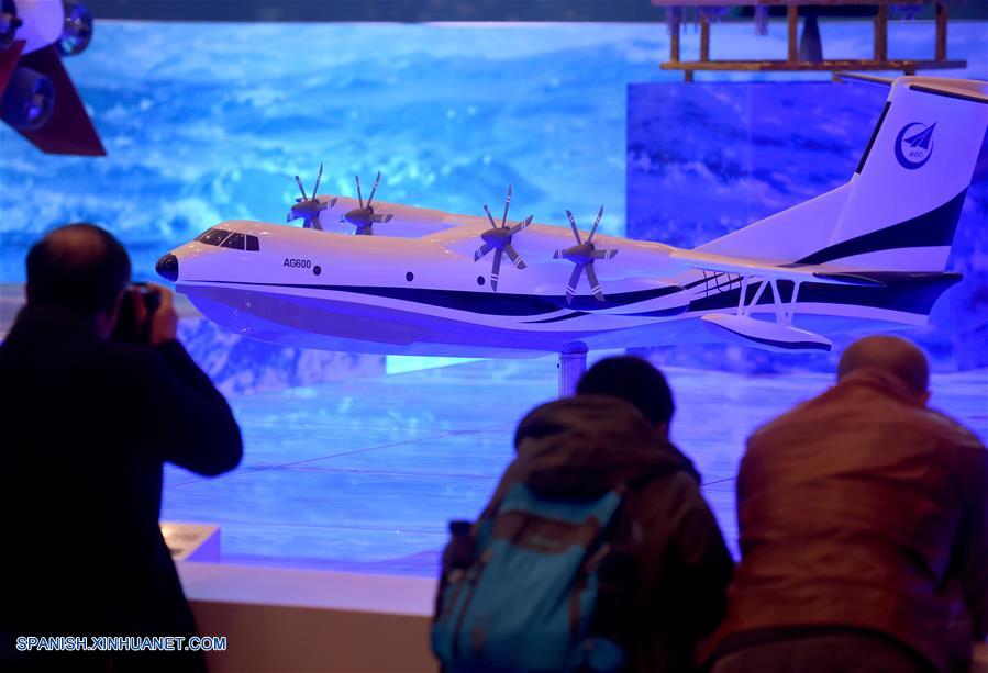 BEIJING, noviembre 14, 2018 (Xinhua) -- Visitantes observan el modelo del gran avión anfibio AG600 en una gran exposición para conmemorar el 40 aniversario de la reforma y apertura de China celebrada en el Museo Nacional de China, en Beijing, capital de China, el 14 de noviembre de 2018. La exposición se inauguró el martes en Beijing. (Xinhua/Luo Xiaoguang)