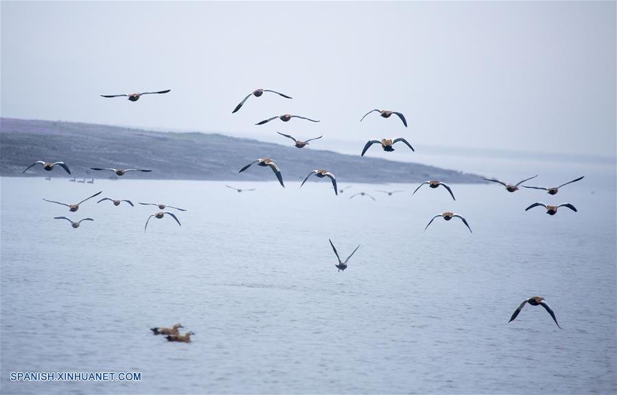 JIANGXI, noviembre 16, 2018 (Xinhua) -- Imagen del 14 de noviembre de 2018 de una vista aérea de grullas grises volando sobre el humedal Duchang del Lago Poyang, en la provincia de Jiangxi, en el este de China. El Lago Poyang, el más grande de agua dulce en China, ha atestiguado una parvada de aves migratorias hibernando. (Xinhua/Fu Jianbin)