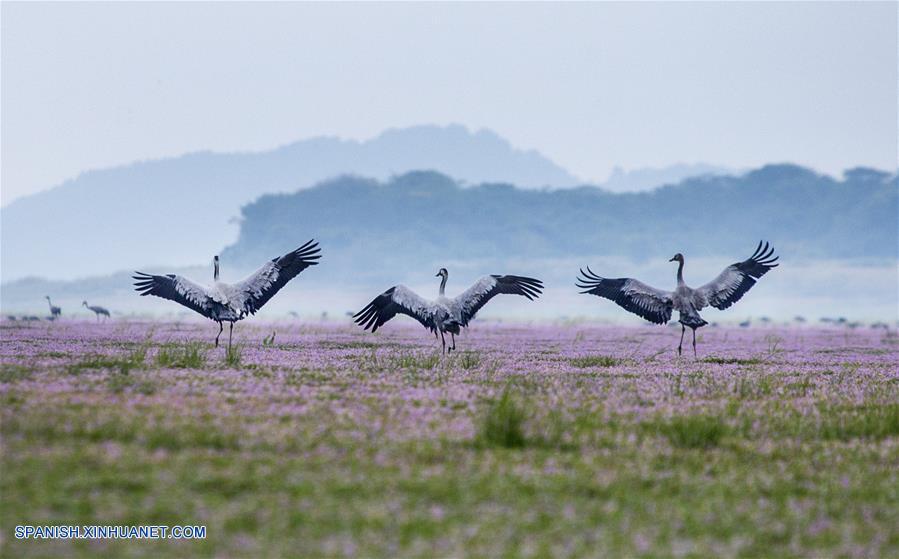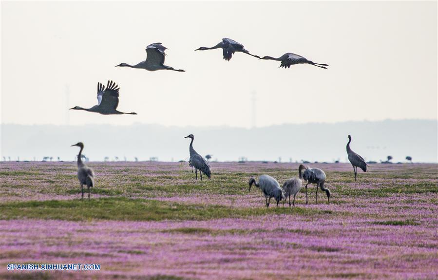 JIANGXI, noviembre 16, 2018 (Xinhua) -- Imagen del 9 de noviembre de 2018 de grullas grises volando sobre el humedal Duchang del Lago Poyang, en la provincia de Jiangxi, en el este de China. El Lago Poyang, el más grande de agua dulce en China, ha atestiguado una parvada de aves migratorias hibernando. (Xinhua/Fu Jianbin)
