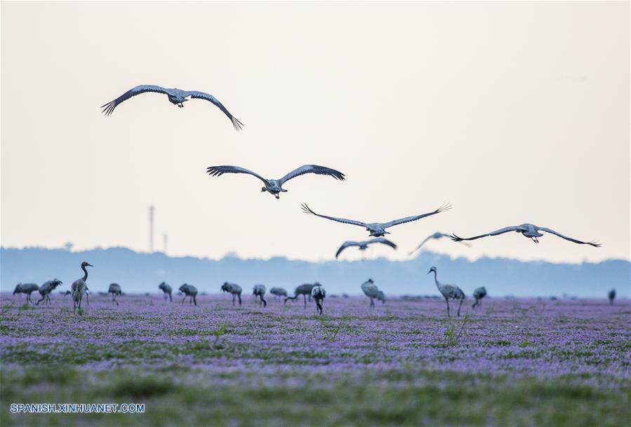JIANGXI, noviembre 16, 2018 (Xinhua) -- Imagen del 14 de noviembre de 2018 de grullas grises volando sobre el humedal Duchang del Lago Poyang, en la provincia de Jiangxi, en el este de China. El Lago Poyang, el más grande de agua dulce en China, ha atestiguado una parvada de aves migratorias hibernando. (Xinhua/Fu Jianbin)