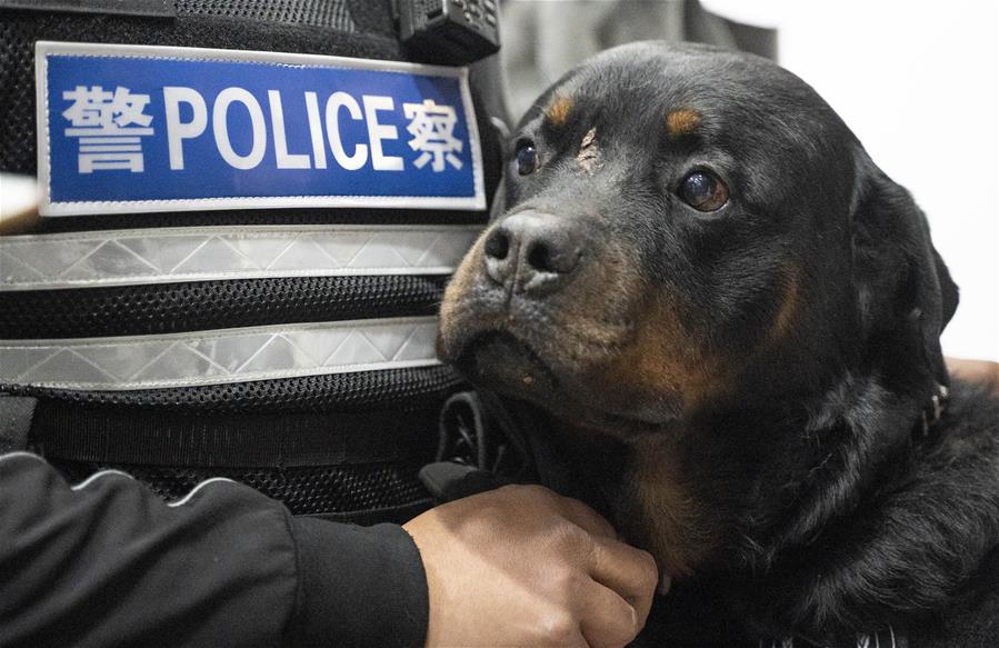 Un perro policía es preparado para participar en el espectáculo durante un concurso de habilidades de perros de la Policía Nacional, en Beijing, capital de China. El concurso fue clausurado el viernes. (Xinhua/Cai Yang)