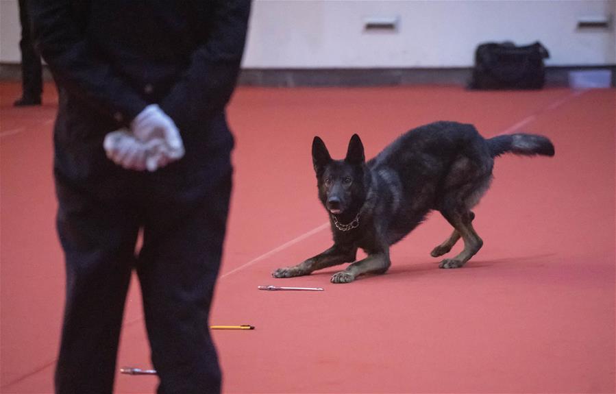 Un perro policía adopta una posición boca abajo para demostrar que el objetivo ha sido encontrado durante un concurso de habilidades de perros de la Policía Nacional, en Beijing, capital de China. El concurso fue clausurado el viernes. (Xinhua/Cai Yang)
