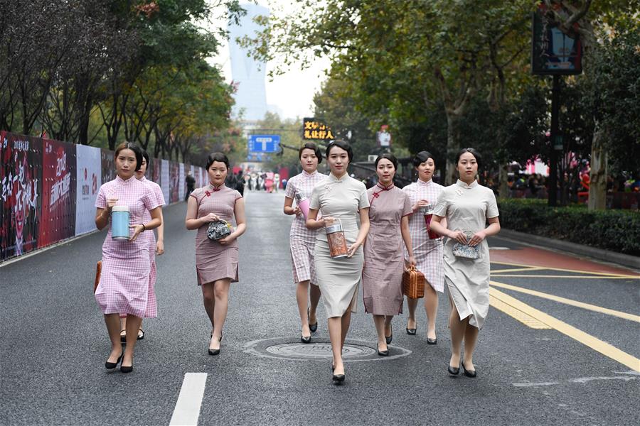 ZHEJIANG, noviembre 17, 2018 (Xinhua) -- Modelos presentan mercancía antigua durante un desfile llevado a cabo en Hangzhou, provincia de Zhejiang, en el este de China, el 17 de noviembre de 2018. (Xinhua/Huang Zongzhi)