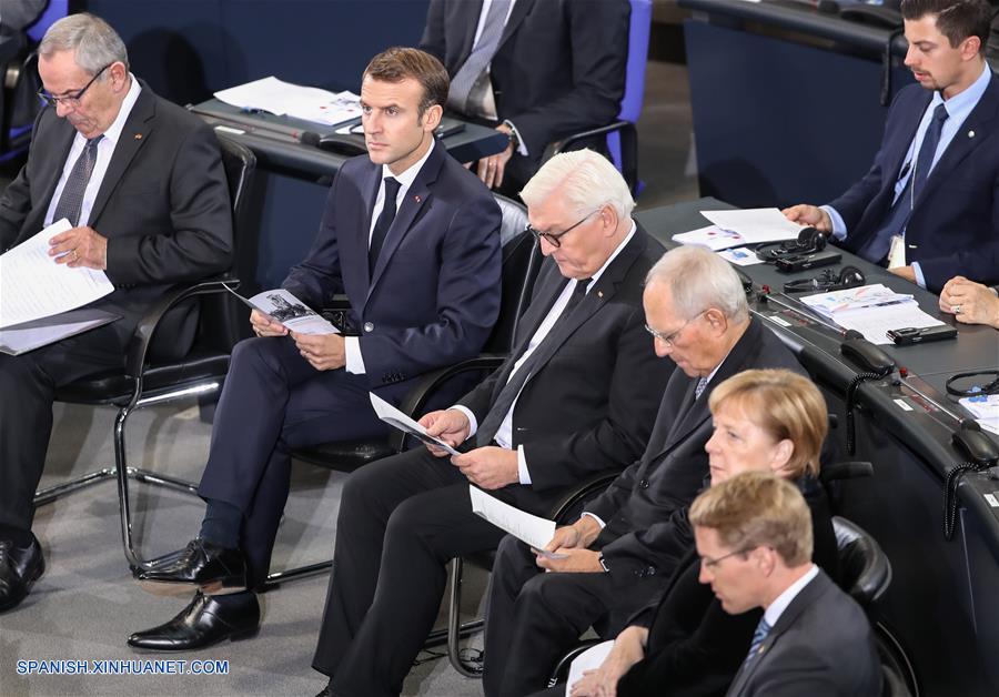 BERLIN, noviembre 18, 2018 (Xinhua) -- El presidente francés Emmanuel Macron (2-i), el presidente alemán, Frank-Walter Steinmeier (3-i), el presidente del Parlamento alemán, Wolfgang Schaeuble (3-d), y la canciller alemana, Angela Merkel (2-d), asisten a un evento para conmemorar el Día de Duelo Nacional de Alemania, en el Parlamento Federal alemán, en Berlín, capital de Alemania, el 18 de noviembre de 2018. El presidente de Francia, Emmanuel Macron, se dirigió el domingo a los legisladores alemanes y pidió la apertura de un nuevo capítulo para Europa y hacerla más integrada, más fuerte y más independiente. Macron visitó el domingo Berlín para asistir a una serie de eventos para conmemorar el Día de Duelo Nacional de Alemania, y se reunió con la canciller alemana, Angela Merkel. (Xinhua/Shan Yuqi)