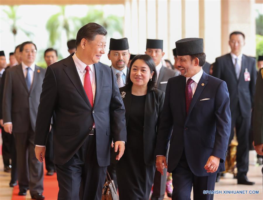 El presidente chino, Xi Jinping (i-frente), y el sultán Haji Hassanal Bolkiah de Brunéi, se dirigen a la sede de sus conversaciones en Bandar Seri Begawan, Brunéi, el 19 de noviembre de 2018. (Xinhua/Ju Peng)