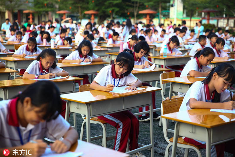 Los estudiantes participan en un concurso de caligrafía celebrado en la escuela secundaria Chengxi en Haikou, provincia de Hainan, 16 de noviembre del 2018. [Foto: IC]