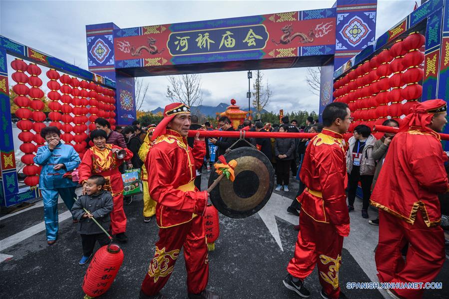 Personas participan durante un desfile de una feria de templo en el municipio Heqiao de Hanzghou, capital de la provincia de Zhejiang, en el este de China, el 19 de noviembre de 2018. La feria del templo se llevó a cabo para mostrar la cultura tradicional en la ciudad antigua de Heqiao, que tiene una historia de más de 1,300 a?os. (Xinhua/Xu Yu)