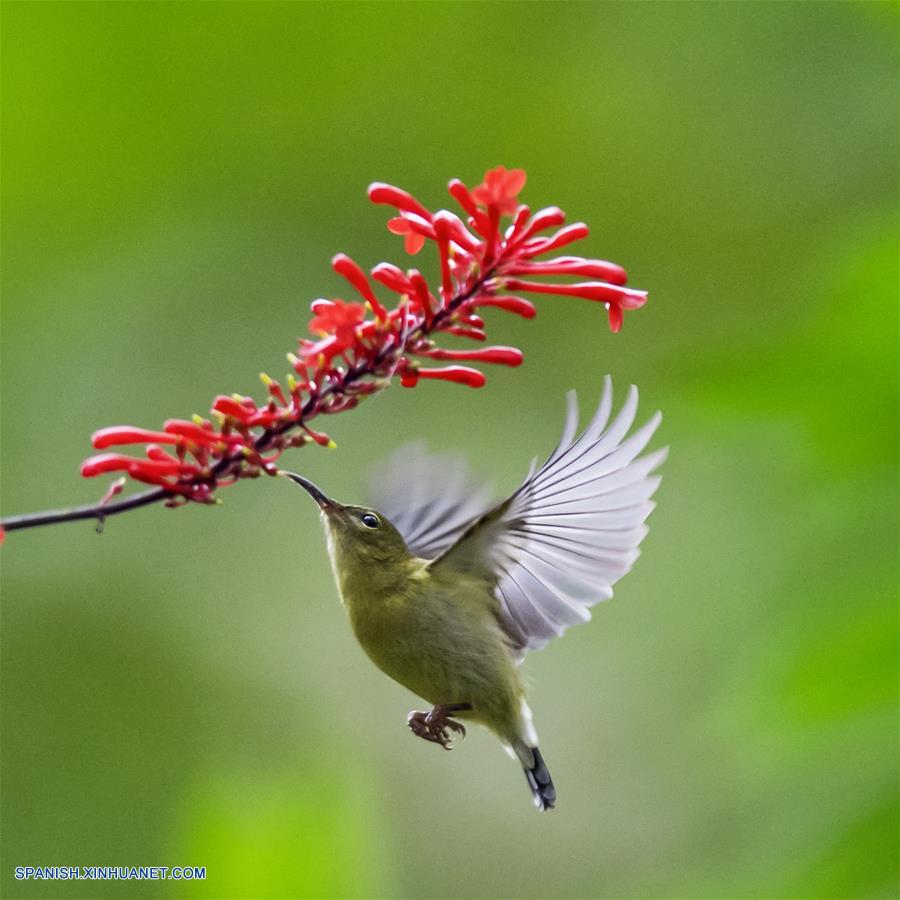 FUJIAN, noviembre 20, 2018 (Xinhua) -- Imagen del 18 de noviembre de 2018 de un sunbird recogiendo miel de una flor en el Parque Nacional Forestal de Fuzhou, en Fuzhou, capital de la provincia de Fujian, en el sureste de China. (Xinhua/Mei Yongcun)