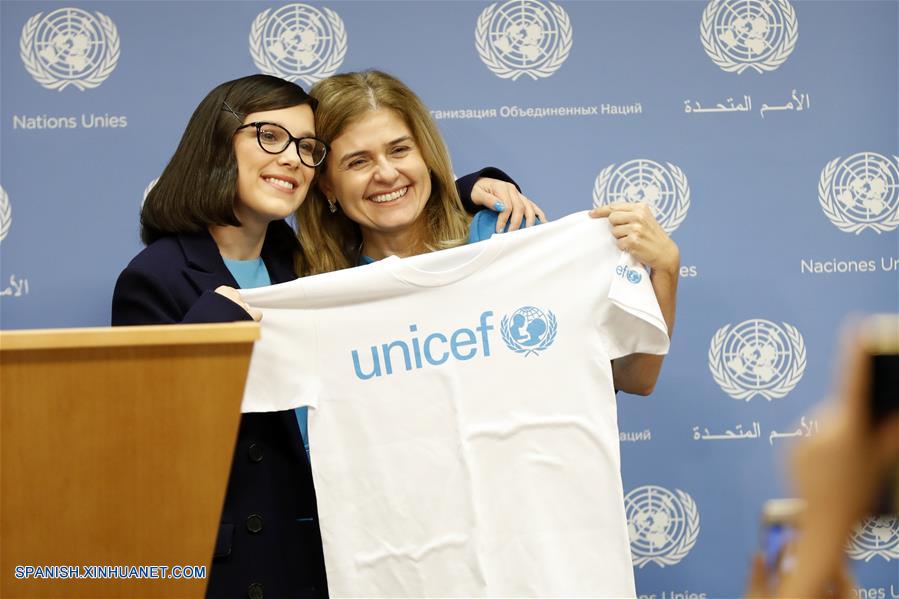 NUEVA YORK, noviembre 20, 2018 (Xinhua) -- La actriz británica Millie Bobby Brown (i), recibe una camiseta de manos de Paloma Escudero (d), directora de Comunicaciones para el Fondo de las Naciones Unidas para la Infancia (UNICEF, por sus siglas en inglés) durante una conferencia de prensa, en la sede de la Organización de las Naciones Unidas (ONU), en Nueva York, Estados Unidos, el 20 de noviembre de 2018. La actriz británica Millie Bobby Brown prometió el martes abogar por los derechos de los ni?os en su nuevo papel como la embajadora de buena voluntad más joven de UNICEF. En una conferencia de prensa en la sede de la ONU, Brown de 14 a?os de edad fue nombrada en el cargo y recibió una camiseta de Unicef de la directora de Comunicaciones de la agencia, Paloma Escudero, con motivo del Día Universal del Ni?o. (Xinhua/Li Muzi)