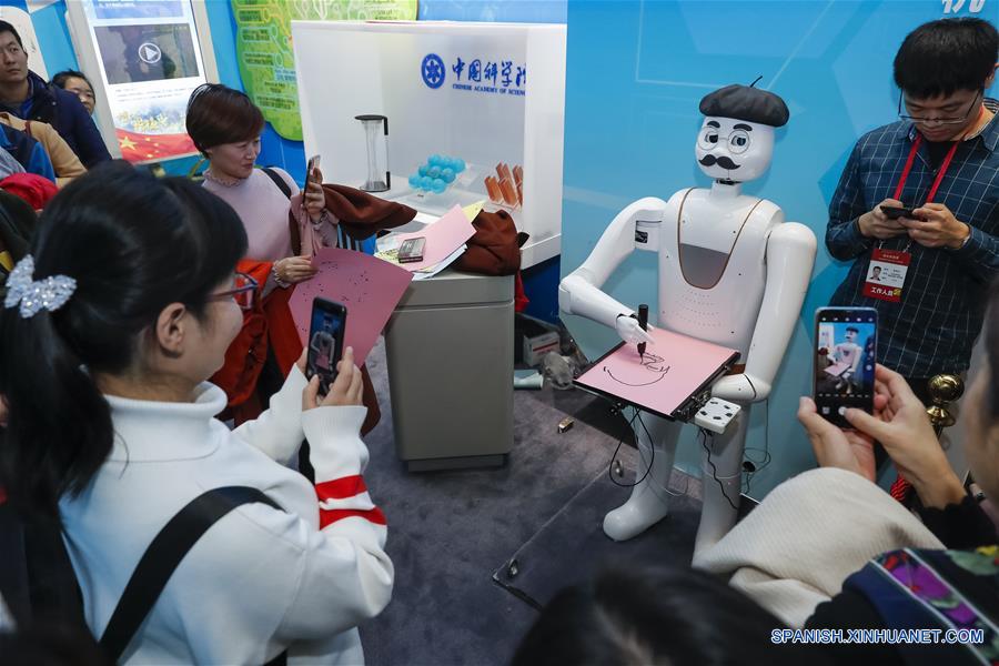 BEIJING, noviembre 20, 2018 (Xinhua) -- Un robot de pintura inteligente con función de reconocimiento facial dibuja un retrato durante una gran exposición para conmemorar el 40 aniversario de la reforma y apertura de China, en el Museo Nacional de China, en Beijing, capital de China, el 20 de noviembre de 2018. (Xinhua/Shen Bohan)