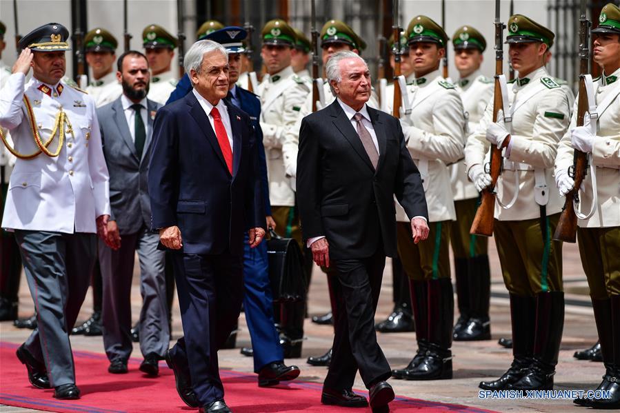 SANTIAGO, noviembre 21, 2018 (Xinhua) -- El presidente de Chile, Sebastián Pi?era (i-frente), y el presidente de Brasil, Michel Temer (d-frente), pasan revista a la Guardia de Honor en el Palacio de La Moneda, en la cuidad de Santiago, capital de Chile, el 21 de noviembre de 2018. El presidente de Brasil, Michel Temer, partió en la ma?ana del miércoles rumbo a Santiago de Chile, donde firmará con su homólogo Sebastián Pi?era un acuerdo de libre comercio entre los dos países. La expectativa es que el acuerdo incremente el comercio bilateral, ampliando las transacciones y elevando el volumen de mercancías y productos. Uno de los principales puntos involucra el fin del cobro de itinerancia internacional para datos y telefonía móvil entre los dos países. (Xinhua/Jorge Villegas)