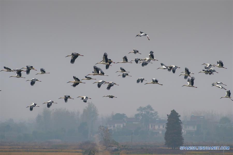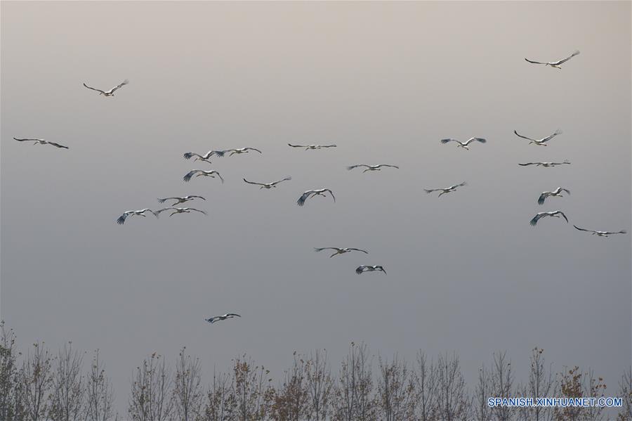 ANHUI, noviembre 22, 2018 (Xinhua) -- Imagen del 21 de noviembre de 2018 de una bandada de cigüe?as blancas orientales volando sobre el parque nacional de humedales Bandao, en Chaohu, provincia de Anhui, en el este de China. Más de 100 cigüe?as blancas orientales volaron al parque recientemente por comida y descanso. (Xinhua/Guo Chen)