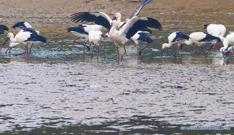 ANHUI, noviembre 22, 2018 (Xinhua) -- Imagen del 21 de noviembre de 2018 de cigüe?as blancas orientales permaneciendo en el parque nacional de humedales Bandao, en Chaohu, provincia de Anhui, en el este de China. Más de 100 cigüe?as blancas orientales volaron al parque recientemente por comida y descanso. (Xinhua/Guo Chen)
