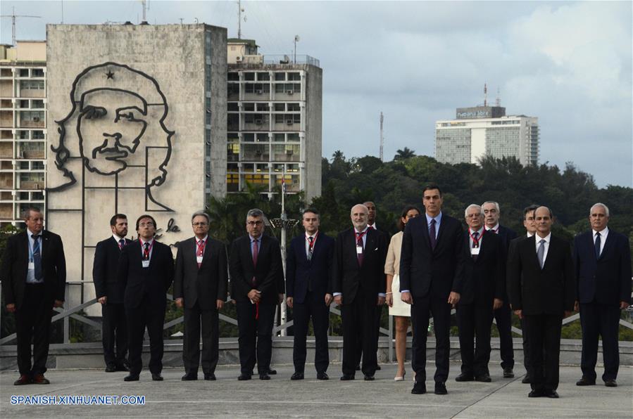 LA HABANA, noviembre 22, 2018 (Xinhua) -- El presidente del Gobierno de Espa?a, Pedro Sánchez (2-d-frente), acompa?ado por Rogelio Sierra (d-frente), viceministro de Relaciones Exteriores de Cuba, participa durante una ceremonia para rendir tributo al héroe nacional de Cuba, José Martí, en la Plaza de la Revolución, en La Habana, capital de Cuba, el 22 de noviembre de 2018. Pedro Sánchez es el tercer jefe de gobierno que visita la isla, luego de que en septiembre último se reunió en Nueva York, en la sede de Naciones Unidas (ONU), con el mandatario cubano Miguel Díaz-Canel, quien lo invitó a viajar a La Habana. (Xinhua/Joaquín Hernández)