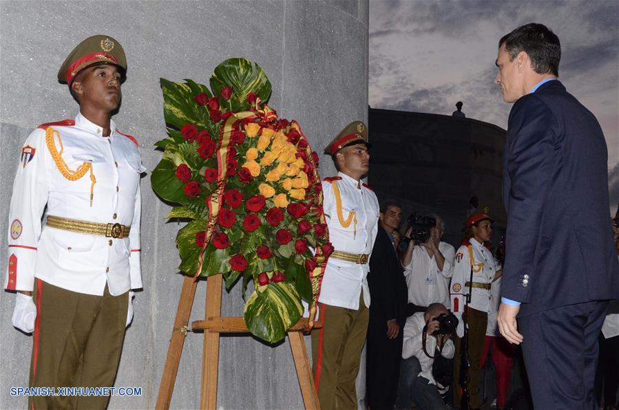 LA HABANA, noviembre 22, 2018 (Xinhua) -- El presidente del Gobierno de Espa?a, Pedro Sánchez (d), participa durante una ceremonia para rendir tributo al héroe nacional de Cuba, José Martí, en la Plaza de la Revolución, en La Habana, capital de Cuba, el 22 de noviembre de 2018. Pedro Sánchez es el tercer jefe de gobierno que visita la isla, luego de que en septiembre último se reunió en Nueva York, en la sede de Naciones Unidas (ONU), con el mandatario cubano Miguel Díaz-Canel, quien lo invitó a viajar a La Habana. (Xinhua/Joaquín Hernández)
