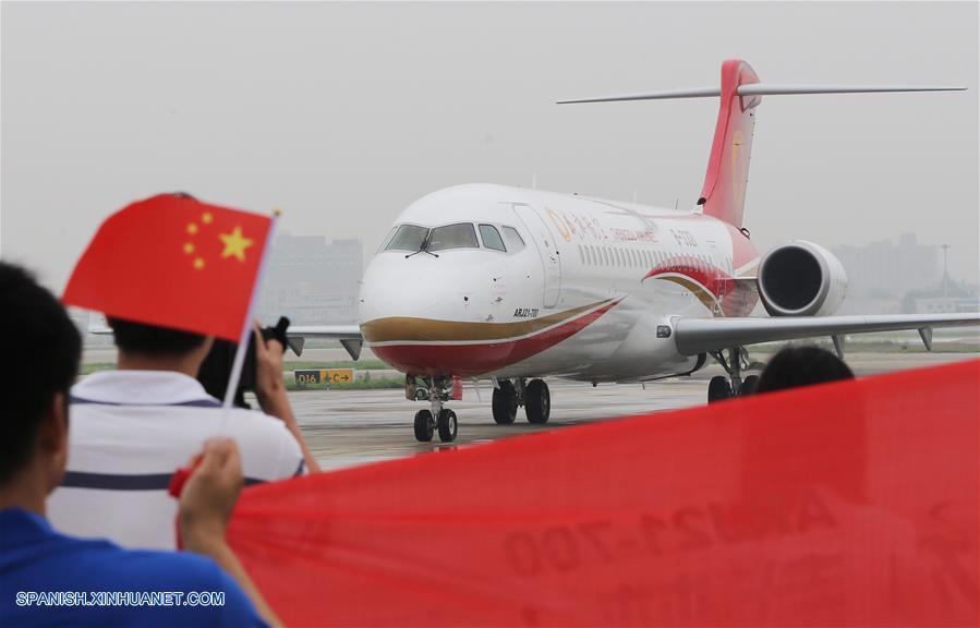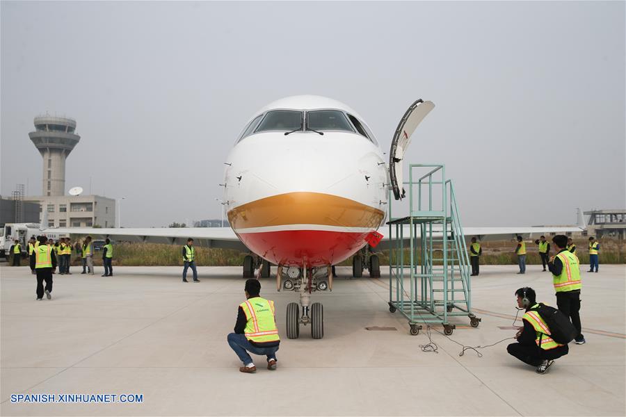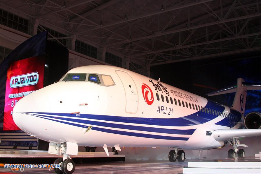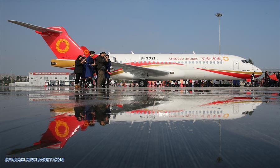 SHANDONG, noviembre 22, 2018 (Xinhua) -- Imagen del 14 de octubre de 2017 de una vista del avión de pasajeros ARJ21-700 en el Aeropuerto Shengli en Dongying, provincia de Shandong, en el este de China. Las subsidiarias de la Corporación de Industria de Aviación de China (AVIC, por sus siglas en inglés) y la Corporación de Aviones Comerciales de China Ltd. (COMAC, por sus siglas en inglés) han establecido un centro de dise?o conjunto para desarrollar las narices de los aviones comerciales desarrollados en China, anunció el miércoles 21 de noviembre AVIC. El acuerdo de cooperación se?ala que AVIC Chengdu Aircraft Corporation Commercial Aircraft Co. Ltd. y el Instituto de Dise?o e Investigación de Aviones de Shanghai de COMAC colaborarán en el centro en el dise?o de narices de todos los modelos de aviones de COMAC. El centro estará involucrado en el dise?o de concepto, dise?o preliminar y dise?ado detallado. Esta es una importante iniciativa en medio de los pasos acelerados del país para construir su industria de aviones civiles, indicó AVIC. AVIC Chengdu Aircraft Corporation Commercial Aircraft es la principal proveedora de China de narices de aviones, puertas de cabinas, superficies desmontables y componentes estructurales de fuselaje. También es responsable del desarrollo de narices para los principales modelos de aviones civiles de China, como los grandes aviones anfibios ARJ21, C919 y AG600. COMAC es la principal desarrolladora de aviones comerciales de China. Su avión regional ARJ21 ha entrado en la etapa de producción masiva y operación de vuelos comerciales y el gran avión de pasajeros de un pasillo C919 realizó con éxito su vuelo inaugural en mayo de 2017. (Xinhua/Ding Ting)
