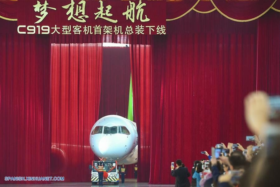 SHANGHAI, noviembre 22, 2018 (Xinhua) -- Imagen del 2 de noviembre de 2015 del C919, el primer avión de pasajeros grande hecho en China, en una planta de Commercial Aircraft Corporation of China, Ltd. (COMAC), en Shanghai, en el este de China. Las subsidiarias de la Corporación de Industria de Aviación de China (AVIC, por sus siglas en inglés) y la Corporación de Aviones Comerciales de China Ltd. (COMAC, por sus siglas en inglés) han establecido un centro de dise?o conjunto para desarrollar las narices de los aviones comerciales desarrollados en China, anunció el miércoles 21 de noviembre AVIC. El acuerdo de cooperación se?ala que AVIC Chengdu Aircraft Corporation Commercial Aircraft Co. Ltd. y el Instituto de Dise?o e Investigación de Aviones de Shanghai de COMAC colaborarán en el centro en el dise?o de narices de todos los modelos de aviones de COMAC. El centro estará involucrado en el dise?o de concepto, dise?o preliminar y dise?ado detallado. Esta es una importante iniciativa en medio de los pasos acelerados del país para construir su industria de aviones civiles, indicó AVIC. AVIC Chengdu Aircraft Corporation Commercial Aircraft es la principal proveedora de China de narices de aviones, puertas de cabinas, superficies desmontables y componentes estructurales de fuselaje. También es responsable del desarrollo de narices para los principales modelos de aviones civiles de China, como los grandes aviones anfibios ARJ21, C919 y AG600. COMAC es la principal desarrolladora de aviones comerciales de China. Su avión regional ARJ21 ha entrado en la etapa de producción masiva y operación de vuelos comerciales y el gran avión de pasajeros de un pasillo C919 realizó con éxito su vuelo inaugural en mayo de 2017. (Xinhua/Pei Xin)