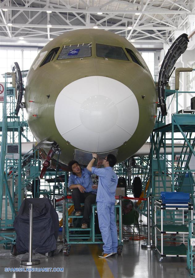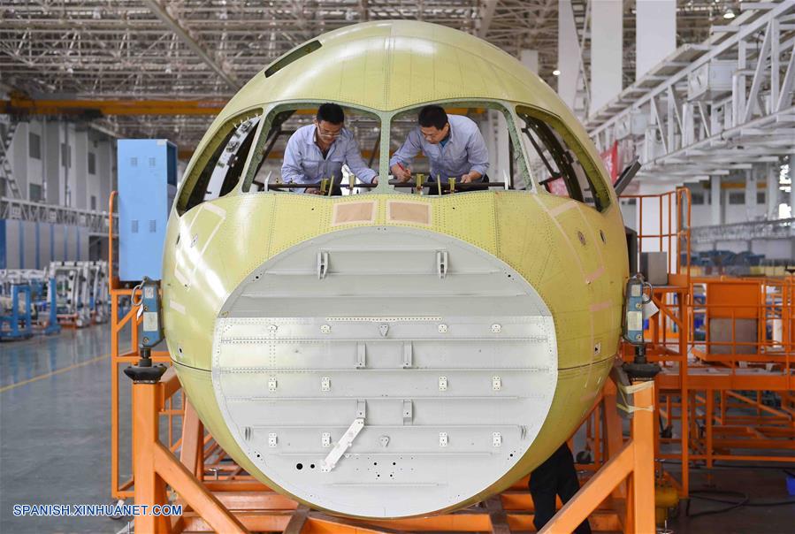 SICHUAN, noviembre 22, 2018 (Xinhua) -- Imagen del 28 de abril de 2017 de técnicos trabajando en la línea de fabricación de la parte frontal del C919, el primer avión de pasajeros grande construido en China, en Chengdu, capital de la provincia de Sichuan, en el suroeste de China. Las subsidiarias de la Corporación de Industria de Aviación de China (AVIC, por sus siglas en inglés) y la Corporación de Aviones Comerciales de China Ltd. (COMAC, por sus siglas en inglés) han establecido un centro de dise?o conjunto para desarrollar las narices de los aviones comerciales desarrollados en China, anunció el miércoles 21 de noviembre AVIC. El acuerdo de cooperación se?ala que AVIC Chengdu Aircraft Corporation Commercial Aircraft Co. Ltd. y el Instituto de Dise?o e Investigación de Aviones de Shanghai de COMAC colaborarán en el centro en el dise?o de narices de todos los modelos de aviones de COMAC. El centro estará involucrado en el dise?o de concepto, dise?o preliminar y dise?ado detallado. Esta es una importante iniciativa en medio de los pasos acelerados del país para construir su industria de aviones civiles, indicó AVIC. AVIC Chengdu Aircraft Corporation Commercial Aircraft es la principal proveedora de China de narices de aviones, puertas de cabinas, superficies desmontables y componentes estructurales de fuselaje. También es responsable del desarrollo de narices para los principales modelos de aviones civiles de China, como los grandes aviones anfibios ARJ21, C919 y AG600. COMAC es la principal desarrolladora de aviones comerciales de China. Su avión regional ARJ21 ha entrado en la etapa de producción masiva y operación de vuelos comerciales y el gran avión de pasajeros de un pasillo C919 realizó con éxito su vuelo inaugural en mayo de 2017. (Xinhua/Liu Kun)
