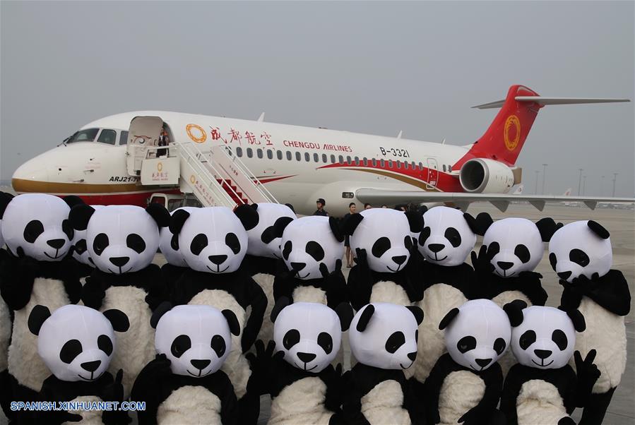 SICHUAN, noviembre 22, 2018 (Xinhua) -- Imagen del 28 de junio de 2016 de mascotas de panda posando frente a avión ARJ21-700 de Chengdu Airlines, en el Aeropuerto Internacional Shuangliu de Chengdu, en Chengdu, capital de la provincia de Sichuan, en el suroeste de China. Las subsidiarias de la Corporación de Industria de Aviación de China (AVIC, por sus siglas en inglés) y la Corporación de Aviones Comerciales de China Ltd. (COMAC, por sus siglas en inglés) han establecido un centro de dise?o conjunto para desarrollar las narices de los aviones comerciales desarrollados en China, anunció el miércoles 21 de noviembre AVIC. El acuerdo de cooperación se?ala que AVIC Chengdu Aircraft Corporation Commercial Aircraft Co. Ltd. y el Instituto de Dise?o e Investigación de Aviones de Shanghai de COMAC colaborarán en el centro en el dise?o de narices de todos los modelos de aviones de COMAC. El centro estará involucrado en el dise?o de concepto, dise?o preliminar y dise?ado detallado. Esta es una importante iniciativa en medio de los pasos acelerados del país para construir su industria de aviones civiles, indicó AVIC. AVIC Chengdu Aircraft Corporation Commercial Aircraft es la principal proveedora de China de narices de aviones, puertas de cabinas, superficies desmontables y componentes estructurales de fuselaje. También es responsable del desarrollo de narices para los principales modelos de aviones civiles de China, como los grandes aviones anfibios ARJ21, C919 y AG600. COMAC es la principal desarrolladora de aviones comerciales de China. Su avión regional ARJ21 ha entrado en la etapa de producción masiva y operación de vuelos comerciales y el gran avión de pasajeros de un pasillo C919 realizó con éxito su vuelo inaugural en mayo de 2017. (Xinhua/Ding Ting)