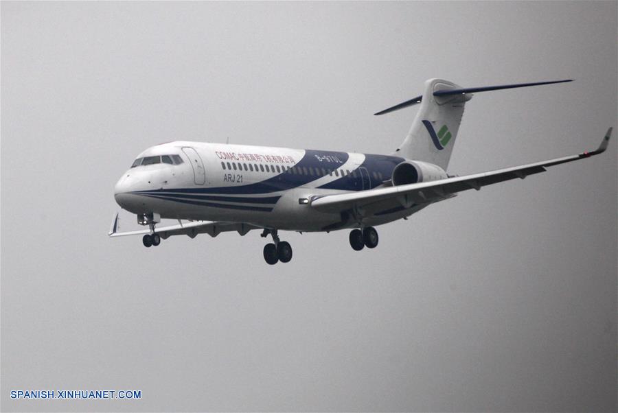 SHAANXI, noviembre 22, 2018 (Xinhua) -- Imagen del 28 de abril de 2014 de un avión regional ARJ21-700 que ha realizado una prueba global llegando a un centro de pruebas, en el distrito de Yanliang de Xi'an, capital de la provincia de Shaanxi, en el noroeste de China. Las subsidiarias de la Corporación de Industria de Aviación de China (AVIC, por sus siglas en inglés) y la Corporación de Aviones Comerciales de China Ltd. (COMAC, por sus siglas en inglés) han establecido un centro de dise?o conjunto para desarrollar las narices de los aviones comerciales desarrollados en China, anunció el miércoles 21 de noviembre AVIC. El acuerdo de cooperación se?ala que AVIC Chengdu Aircraft Corporation Commercial Aircraft Co. Ltd. y el Instituto de Dise?o e Investigación de Aviones de Shanghai de COMAC colaborarán en el centro en el dise?o de narices de todos los modelos de aviones de COMAC. El centro estará involucrado en el dise?o de concepto, dise?o preliminar y dise?ado detallado. Esta es una importante iniciativa en medio de los pasos acelerados del país para construir su industria de aviones civiles, indicó AVIC. AVIC Chengdu Aircraft Corporation Commercial Aircraft es la principal proveedora de China de narices de aviones, puertas de cabinas, superficies desmontables y componentes estructurales de fuselaje. También es responsable del desarrollo de narices para los principales modelos de aviones civiles de China, como los grandes aviones anfibios ARJ21, C919 y AG600. COMAC es la principal desarrolladora de aviones comerciales de China. Su avión regional ARJ21 ha entrado en la etapa de producción masiva y operación de vuelos comerciales y el gran avión de pasajeros de un pasillo C919 realizó con éxito su vuelo inaugural en mayo de 2017. (Xinhua/Ding Ting)