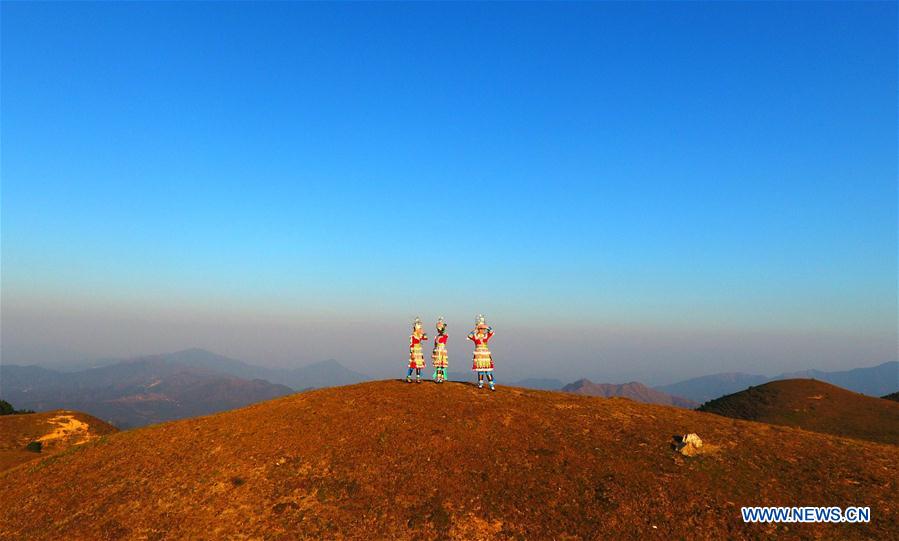 Celebración en Yaogao, Rongshui Miao, Región Autónoma Zhuang de Guangxi. En esta región multi-étnica, las personas suelen vestir sus trajes identitarios durante los festivales y festejos tradicionales. Los singulares patrones de cada estilo reflejan la gran diversidad étnica de la Región Autónoma Zhuang de Guangxi. 12 de noviembre del 2018. (Foto: Xinhua/ Huang Xiaobang)