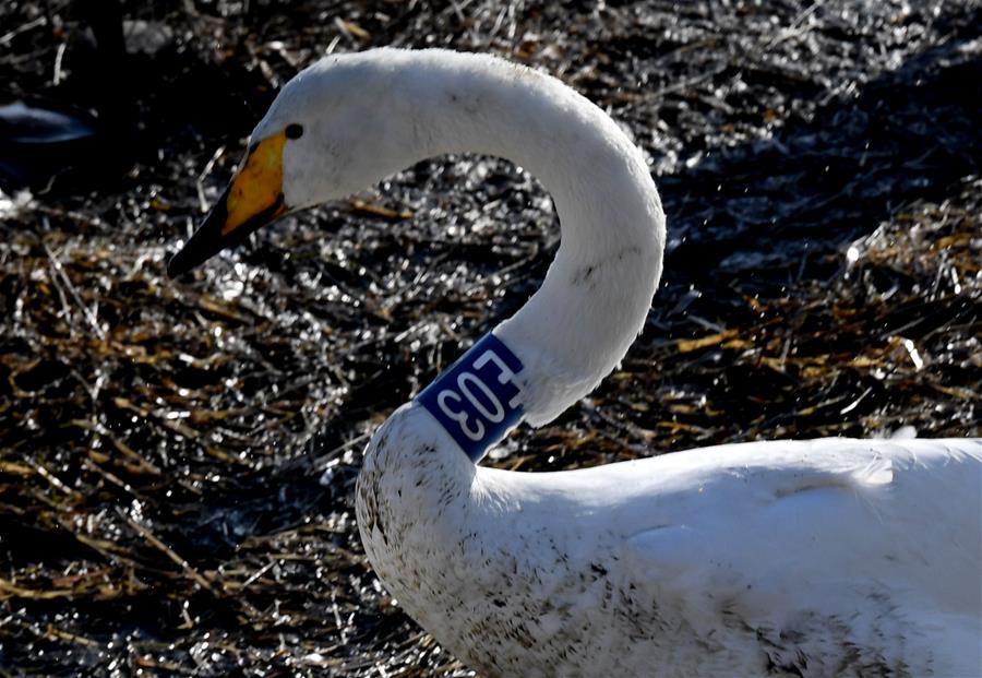 Imagen del 22 de noviembre de 2018 de un cisne blanco portando un collar de rastreo descansando en el humedal del río Amarillo, en Sanmenxia, provincia de Henan, en el centro de China. Los cisnes blancos vuelan desde Siberia al humedal del río Amarillo para pasar el invierno. (Xinhua/Zhu Xiang)