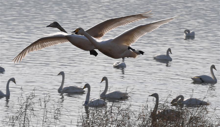 Imagen del 22 de noviembre de 2018 de cisnes blancos volando en el humedal del río Amarillo, en Sanmenxia, provincia de Henan, en el centro de China. Los cisnes blancos vuelan desde Siberia al humedal del río Amarillo para pasar el invierno. (Xinhua/Zhu Xiang)