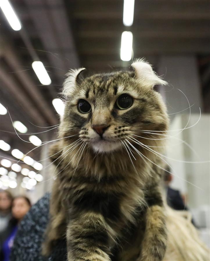 Vista de un gato Curl Americano durante la Exhibición de Gatos Americanos de Bolonia 2018, en Bolonia, Italia, el 24 de noviembre de 2018. Unos 170 gatos participan en la exhibición de gatos del 24 al 25 de noviembre. (Xinhua/Cheng Tingting)