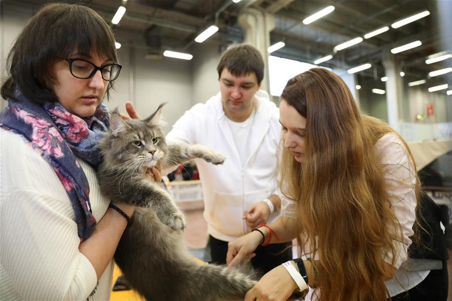 Personas cepillan a un gato Maine Coon durante la Exhibición de Gatos Americanos de Bolonia 2018, en Bolonia, Italia, el 24 de noviembre de 2018. Unos 170 gatos participan en la exhibición de gatos del 24 al 25 de noviembre. (Xinhua/Cheng Tingting)