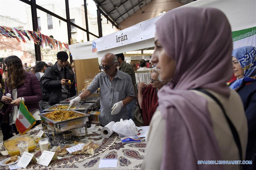 Participantes venden alimentos típicos durante la 9 edición de la Fiesta de las Migraciones, en Montevideo, capital de Uruguay, el 24 de noviembre de 2018. Esta fiesta, que se lleva a cabo del 24 al 25 de noviembre, es el mayor evento de los colectivos migrantes que se realiza en Uruguay, organizada por la Red de Apoyo al Migrante y el Museo de las Migraciones (MUMI), a través del Departamento de Cultura de la Intendencia de Montevideo, y presenta manifestaciones culturales, bailes y espectáculos típicos de los países representados, además de invitar al público a conocer y degustar alimentos y bebidas propias de cada colectivo, de acuerdo con información de la prensa local. (Xinhua/Nicolás Celaya)