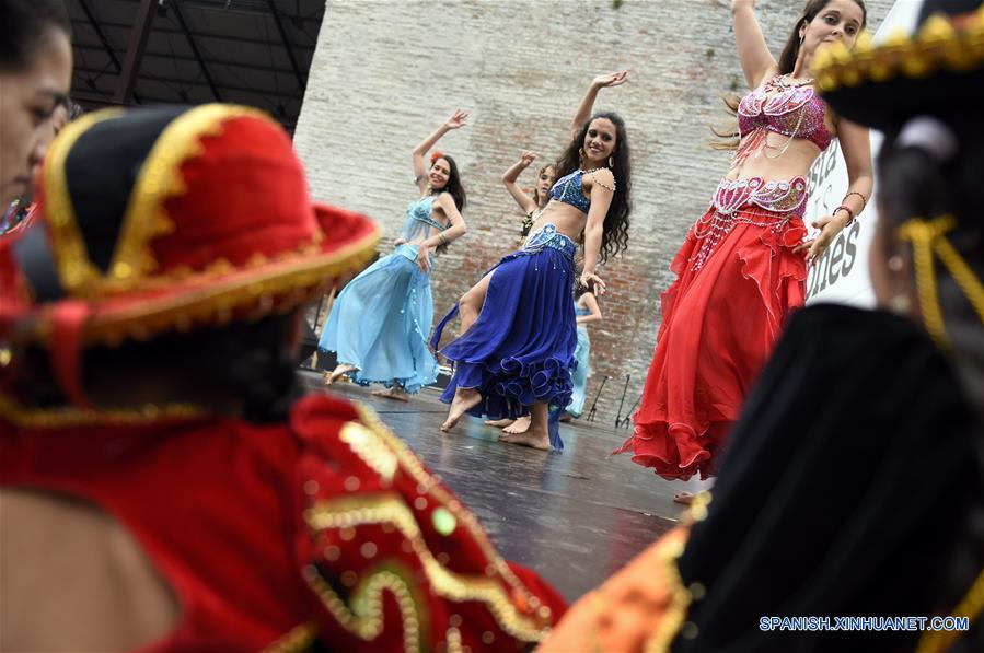 Participantes realizan su presentación de danza durante la 9 edición de la Fiesta de las Migraciones, en Montevideo, capital de Uruguay, el 24 de noviembre de 2018. Esta fiesta, que se lleva a cabo del 24 al 25 de noviembre, es el mayor evento de los colectivos migrantes que se realiza en Uruguay, organizada por la Red de Apoyo al Migrante y el Museo de las Migraciones (MUMI), a través del Departamento de Cultura de la Intendencia de Montevideo, y presenta manifestaciones culturales, bailes y espectáculos típicos de los países representados, además de invitar al público a conocer y degustar alimentos y bebidas propias de cada colectivo, de acuerdo con información de la prensa local. (Xinhua/Nicolás Celaya)