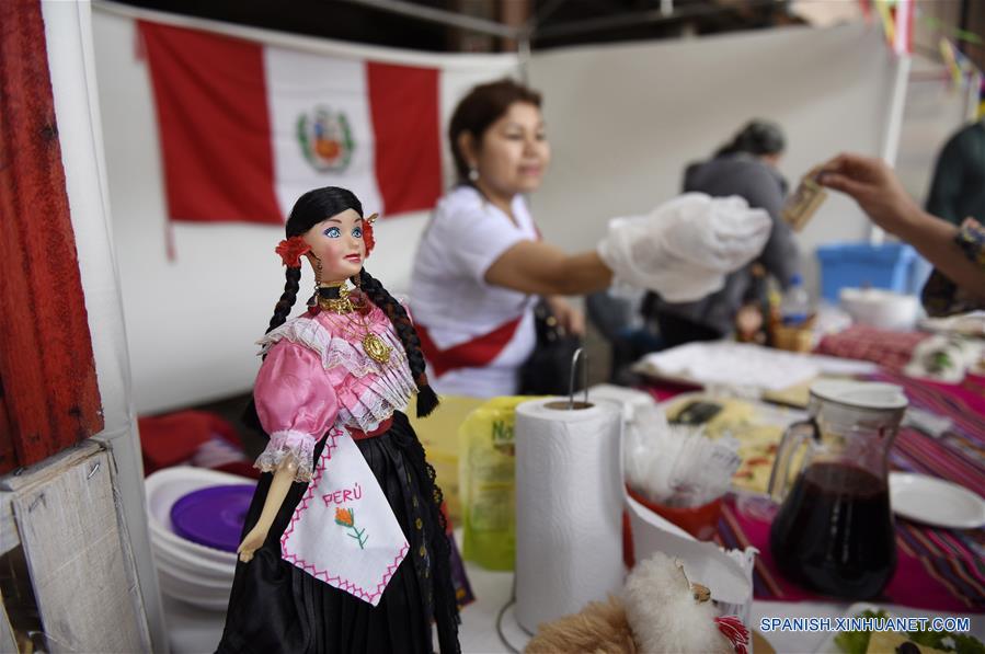 Participantes venden alimentos típicos durante la 9 edición de la Fiesta de las Migraciones, en Montevideo, capital de Uruguay, el 24 de noviembre de 2018. Esta fiesta, que se lleva a cabo del 24 al 25 de noviembre, es el mayor evento de los colectivos migrantes que se realiza en Uruguay, organizada por la Red de Apoyo al Migrante y el Museo de las Migraciones (MUMI), a través del Departamento de Cultura de la Intendencia de Montevideo, y presenta manifestaciones culturales, bailes y espectáculos típicos de los países representados, además de invitar al público a conocer y degustar alimentos y bebidas propias de cada colectivo, de acuerdo con información de la prensa local. (Xinhua/Nicolás Celaya)