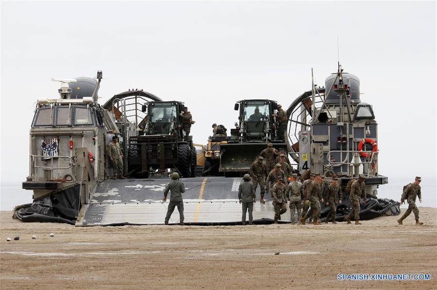 Integrantes de una unidad de desembarco de la Armada de Estados Unidos participan en el ejercicio de respuesta rápida ante desastres "Olas Solidarias", en la playa de Agua Dulce del distrito de Chorrillos, provincia de Lima, Perú, el 24 de noviembre de 2018. De acuerdo con información de la prensa local, las fuerzas navales de Perú y Estados Unidos llevaron a cabo el ejercicio "Olas Solidarias", donde participaron también integrantes del Ejército, la Fuerza Aérea, la Policía Nacional, el Cuerpo General de Bomberos, y el Ministerio de Salud, entre otros, en un simulacro de terremoto de 8.5 grados de magnitud con epicentro frente a las costas Lima y alerta de tsunami. (Xinhua/Luis Camacho)