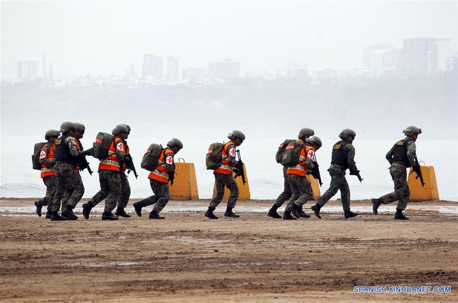 Soldados peruanos y estadounidenses participan en el ejercicio de respuesta rápida ante desastres "Olas Solidarias", en la playa de Agua Dulce del distrito de Chorrillos, provincia de Lima, Perú, el 24 de noviembre de 2018. De acuerdo con información de la prensa local, las fuerzas navales de Perú y Estados Unidos llevaron a cabo el ejercicio "Olas Solidarias", donde participaron también integrantes del Ejército, la Fuerza Aérea, la Policía Nacional, el Cuerpo General de Bomberos, y el Ministerio de Salud, entre otros, en un simulacro de terremoto de 8.5 grados de magnitud con epicentro frente a las costas Lima y alerta de tsunami. (Xinhua/Luis Camacho)