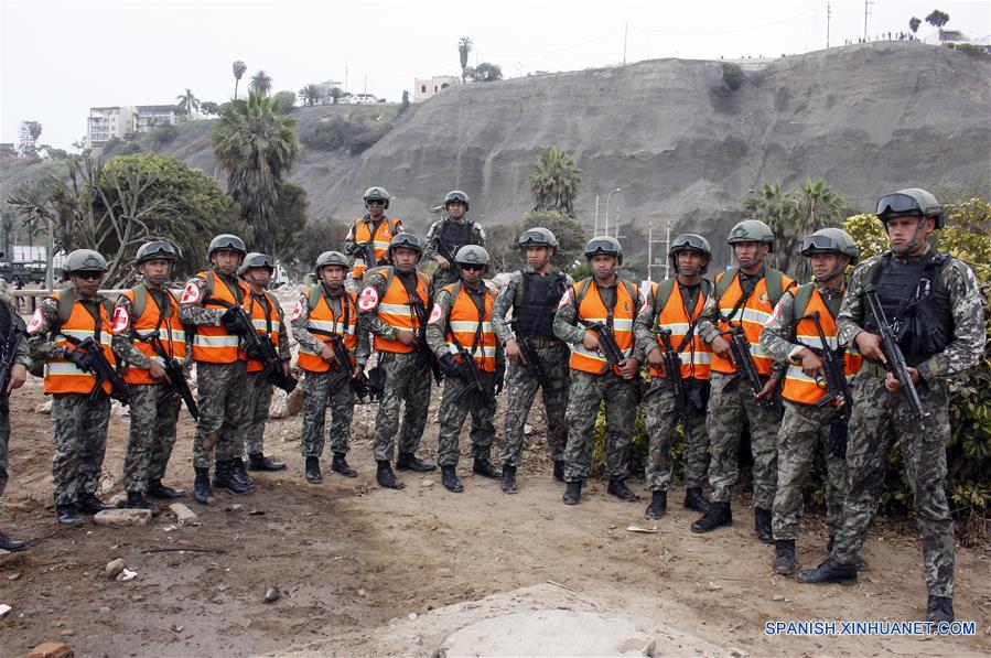 Soldados del Ejército peruano participan en el ejercicio de respuesta rápida ante desastres "Olas Solidarias", en la playa de Agua Dulce del distrito de Chorrillos, provincia de Lima, Perú, el 24 de noviembre de 2018. De acuerdo con información de la prensa local, las fuerzas navales de Perú y Estados Unidos llevaron a cabo el ejercicio "Olas Solidarias", donde participaron también integrantes del Ejército, la Fuerza Aérea, la Policía Nacional, el Cuerpo General de Bomberos, y el Ministerio de Salud, entre otros, en un simulacro de terremoto de 8.5 grados de magnitud con epicentro frente a las costas Lima y alerta de tsunami. (Xinhua/Luis Camacho)