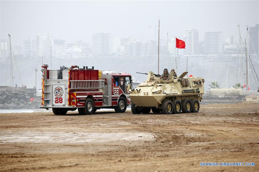 Vehículos del Ejército peruano y del Cuerpo General de Bomberos participan en el ejercicio de respuesta rápida ante desastres "Olas Solidarias", en la playa de Agua Dulce del distrito de Chorrillos, provincia de Lima, Perú, el 24 de noviembre de 2018. De acuerdo con información de la prensa local, las fuerzas navales de Perú y Estados Unidos llevaron a cabo el ejercicio "Olas Solidarias", donde participaron también integrantes del Ejército, la Fuerza Aérea, la Policía Nacional, el Cuerpo General de Bomberos, y el Ministerio de Salud, entre otros, en un simulacro de terremoto de 8.5 grados de magnitud con epicentro frente a las costas Lima y alerta de tsunami. (Xinhua/Luis Camacho)