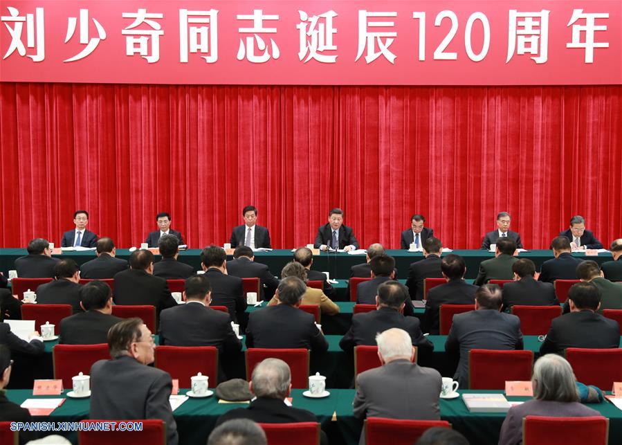 El Comité Central del Partido Comunista de China (PCCh) sostiene un simposio para conmemorar el 120 aniversario del nacimiento de Liu Shaoqi, en el Gran Palacio del Pueblo en Beijing, capital de China, el 23 de noviembre de 2018. El presidente chino, Xi Jinping, también secretario general del Comité Central del PCCh y presidente de la Comisión Militar Central, pronunció un discurso en el simposio, al que también asistieron Li Keqiang, Li Zhanshu, Wang Yang, Wang Huning, Zhao Leji y Han Zheng, todos miembros del Comité Permanente del Buró Político del Comité Central del PCCh. (Xinhua/Pang Xinglei)